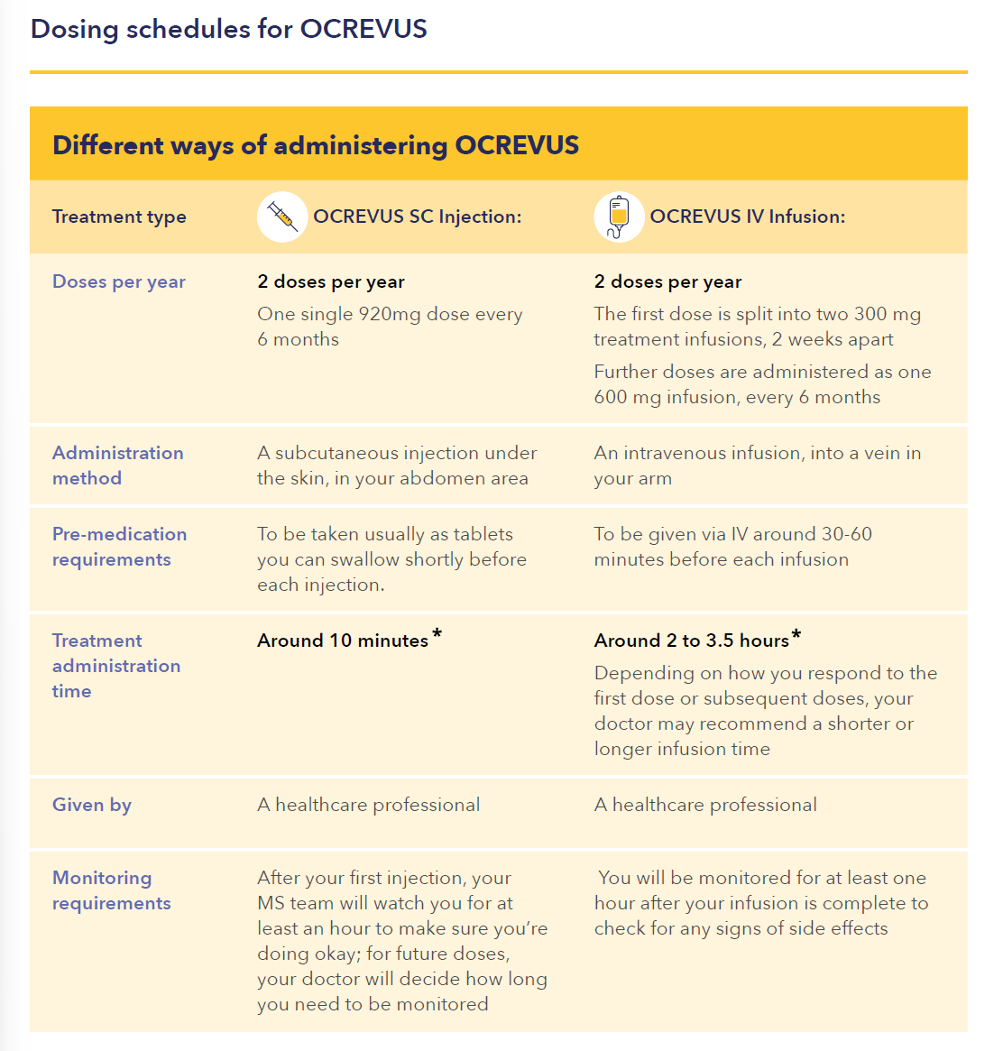 - As an intravenous infusion into the vein (OCREVUS IV)
